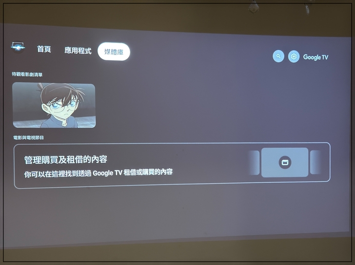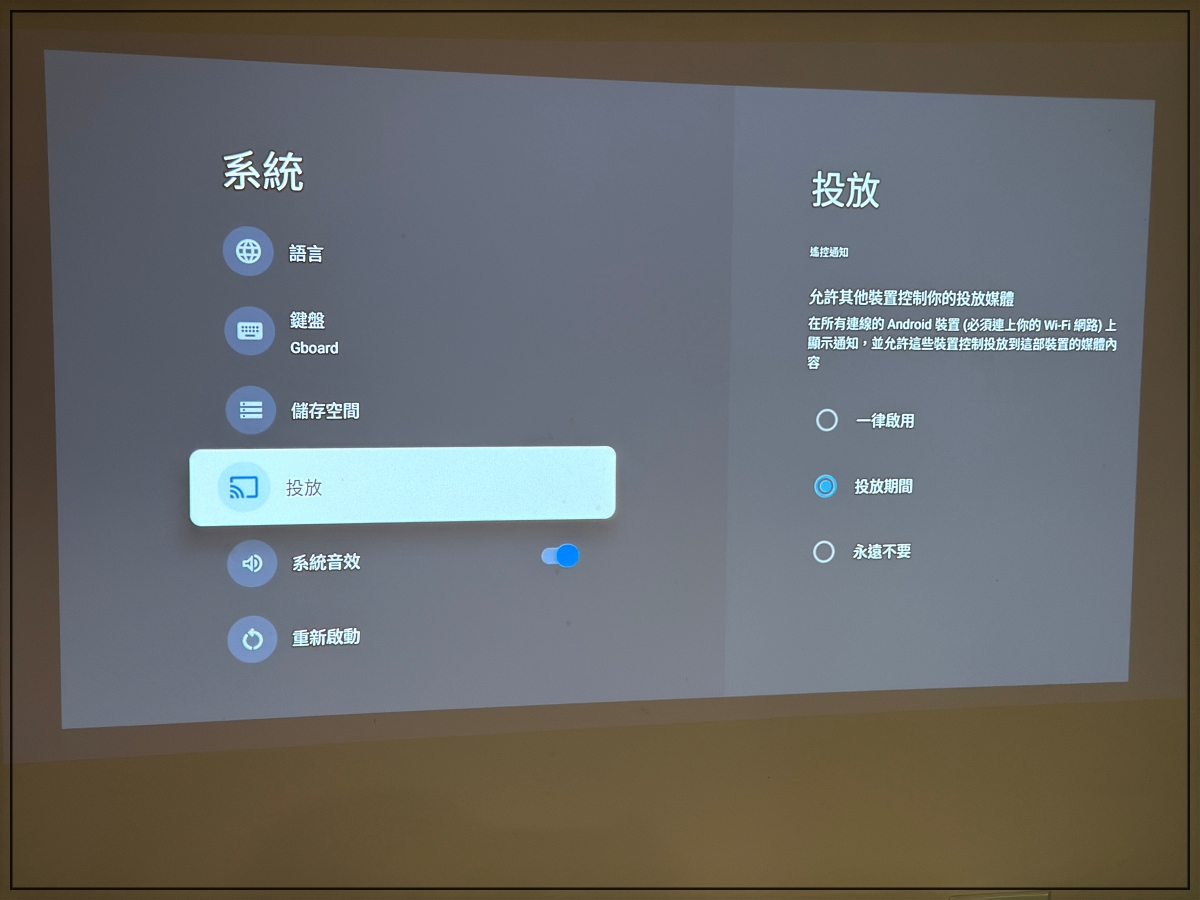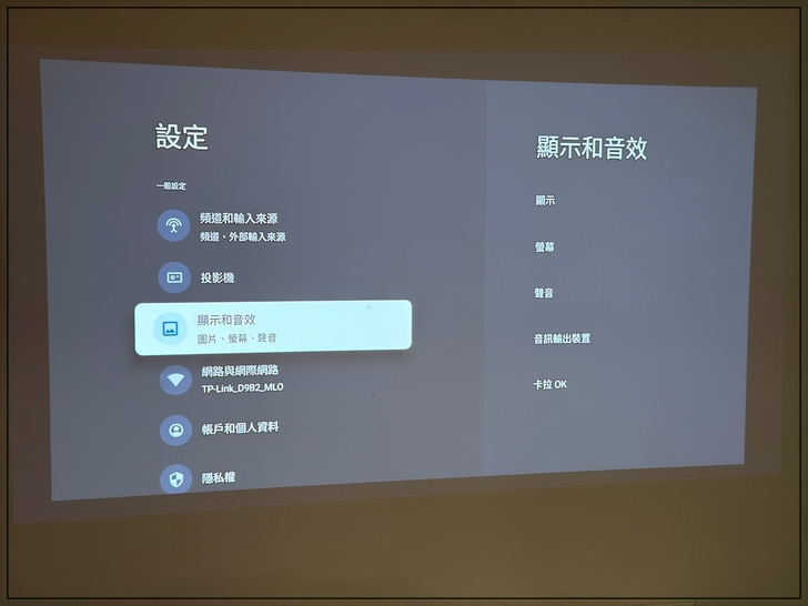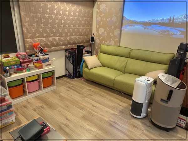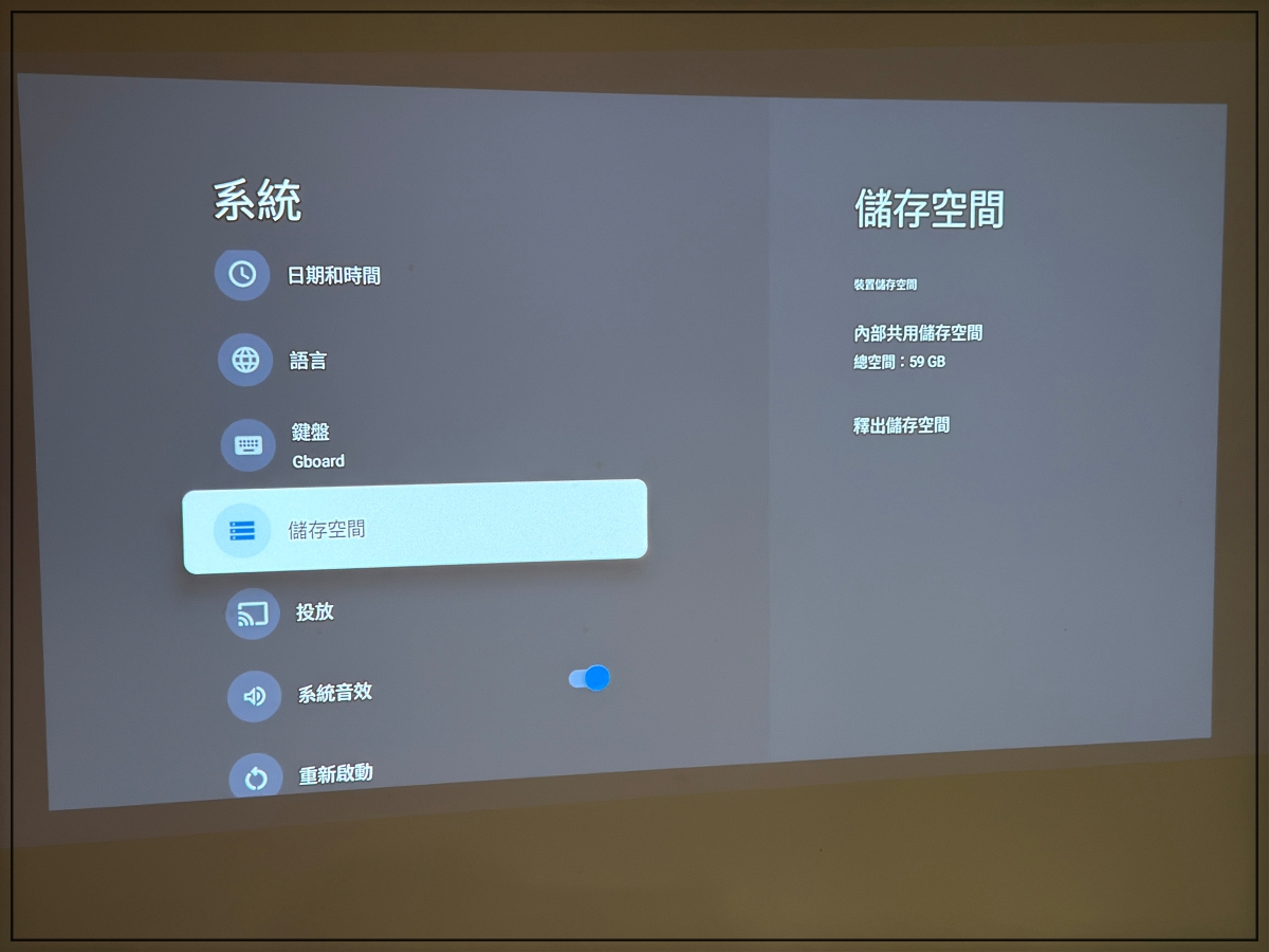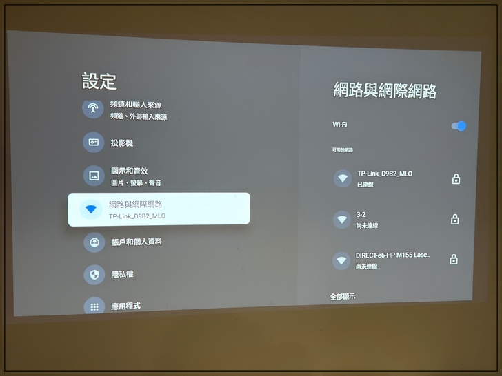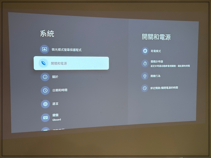 先來看一下我家客廳的投影狀況,目前我沒有布幕,所以是直接反過來投在牆壁上,投影機會自動設定投影畫面大小、方向、梯形校正等,完全都是自動的,這部分等等會著重介紹。