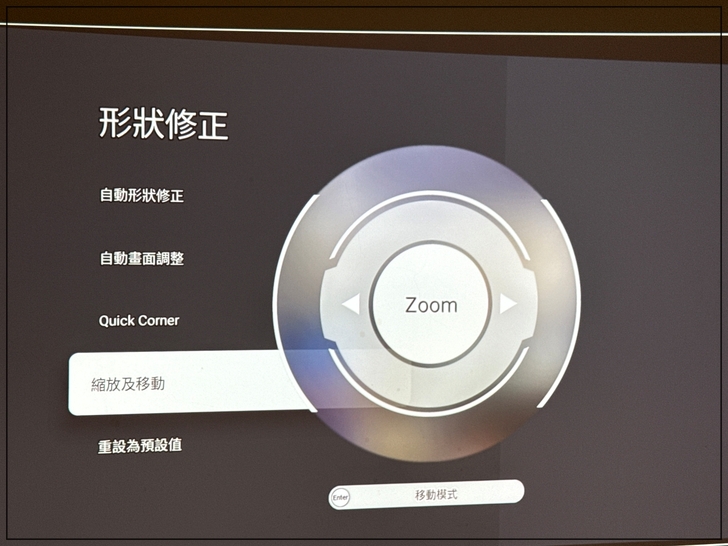 縮放及移動也是手動功能,可以調整投影畫面大小及位置,適用於有障礙物的牆面。