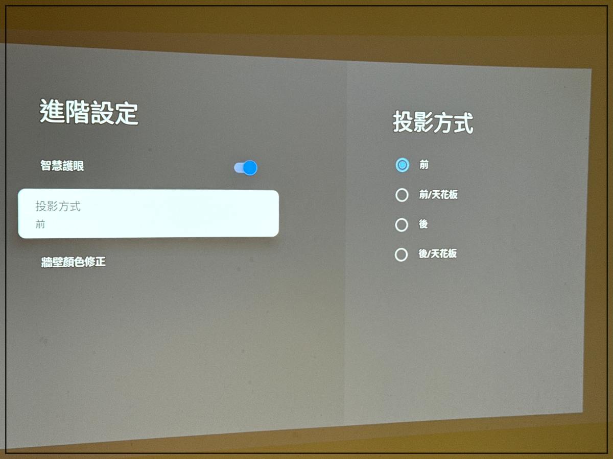 投影方式:天花板模式會上下顛倒,後投影會左右顛倒,專門應對特殊投影需求。