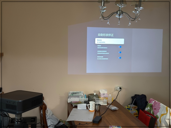 臥室使用,因為床中間不方便放投影機,這時自動修正功能就發揮大作用。