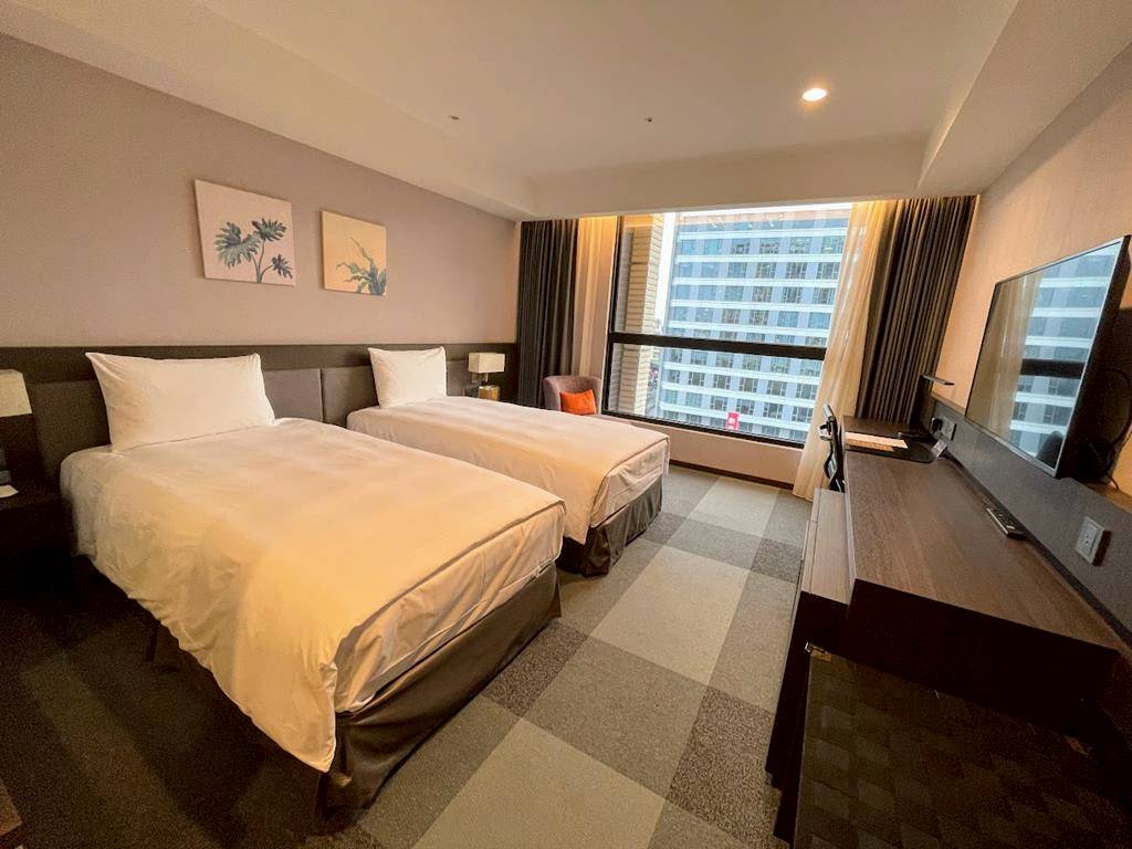 煙波大飯店台南館共有536間客房,提供六種從9到14坪不等的房型選擇,從雙人房到豪華家庭房,可滿足不同旅客的需求。客房設計整體偏向商務風格,簡約又實用,陽光從窗戶灑落,讓房間更顯明亮。