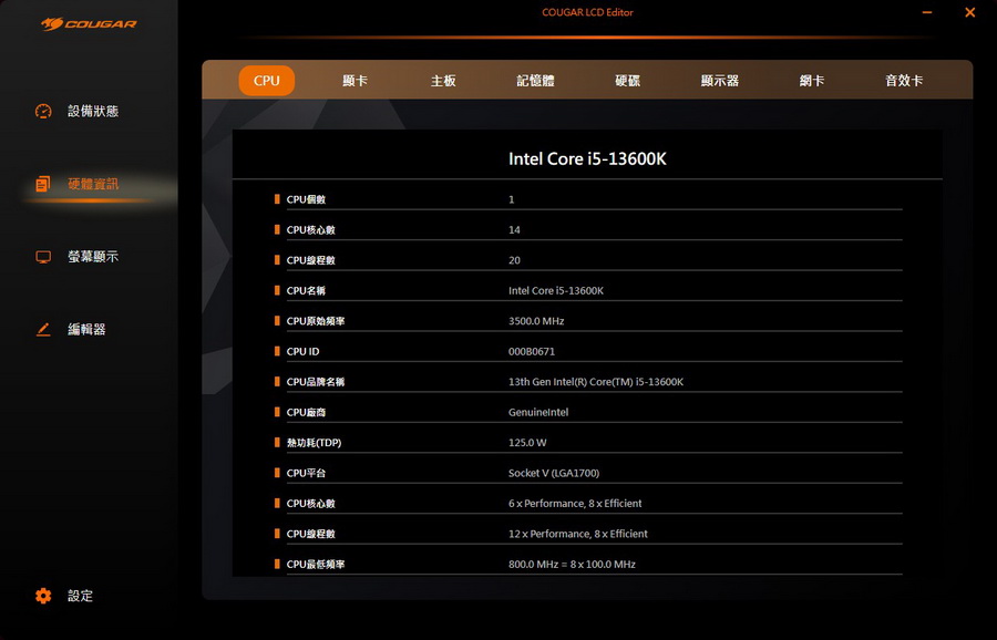 ▼ COUGAR LCD Editor 軟體 可以設定螢幕想要呈現資料及方式