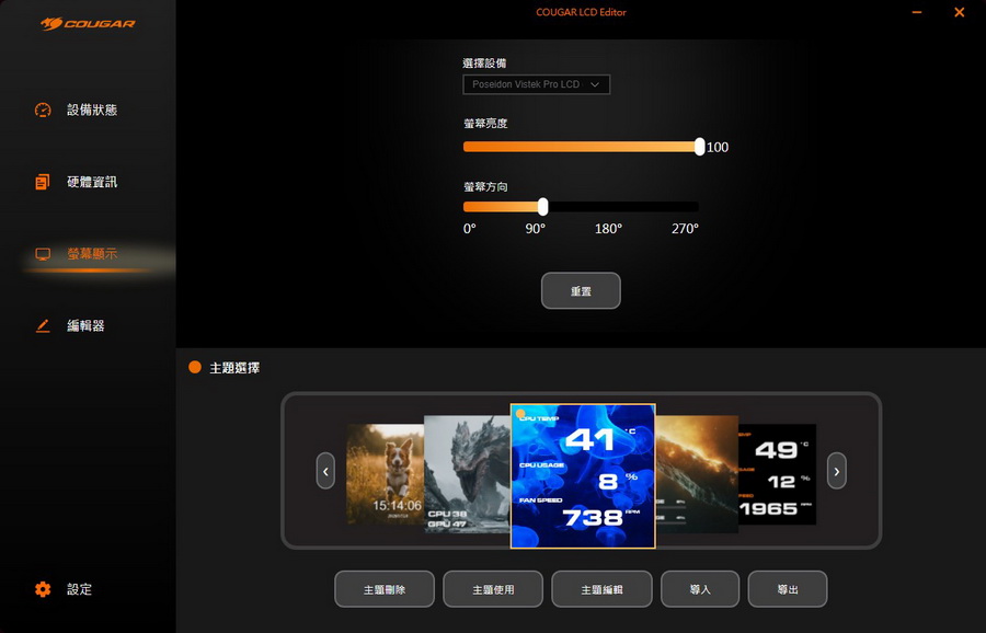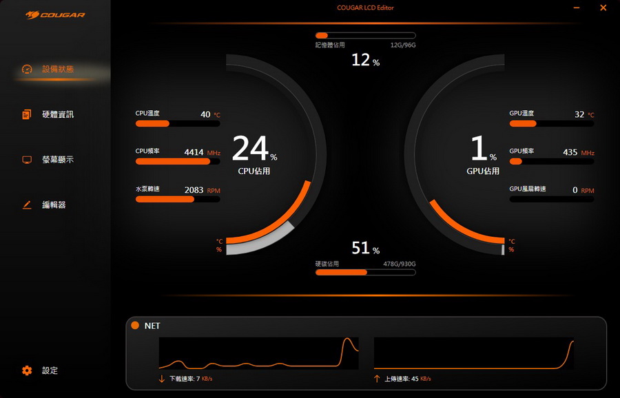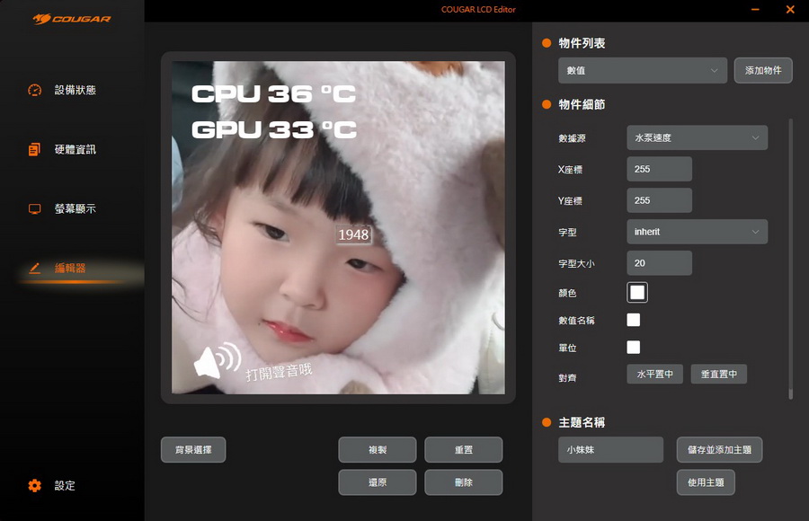 COUGAR LCD Editor 軟體 操作起來簡潔易懂,螢幕上可以調整設定的細節不少,如果想要螢幕呈現更多自己想要的內容,多點擊幾次就可以上手了,體驗下來可玩性非常高。
