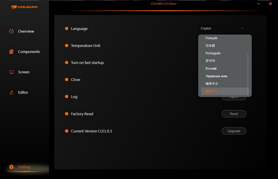 ▼ COUGAR LCD Editor 軟體 剛裝好時是英文的,記得進去設定頁面調整成 繁體中文。