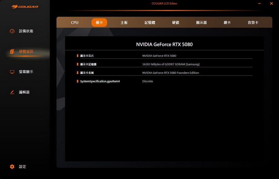 顯示卡:NVIDIA GeForce RTX 5080