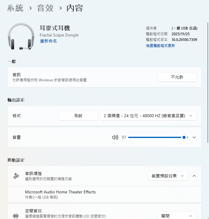 從系統音效設定中可以看到,裝置名稱 Fractal Scape Dongle