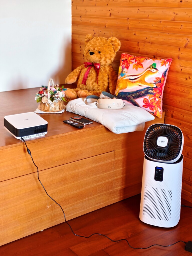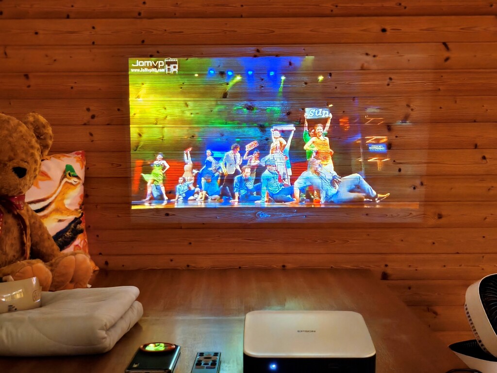 但Epson這款可以判讀牆面智慧顏色,目前投影在小木屋木板上,
