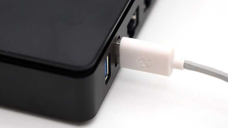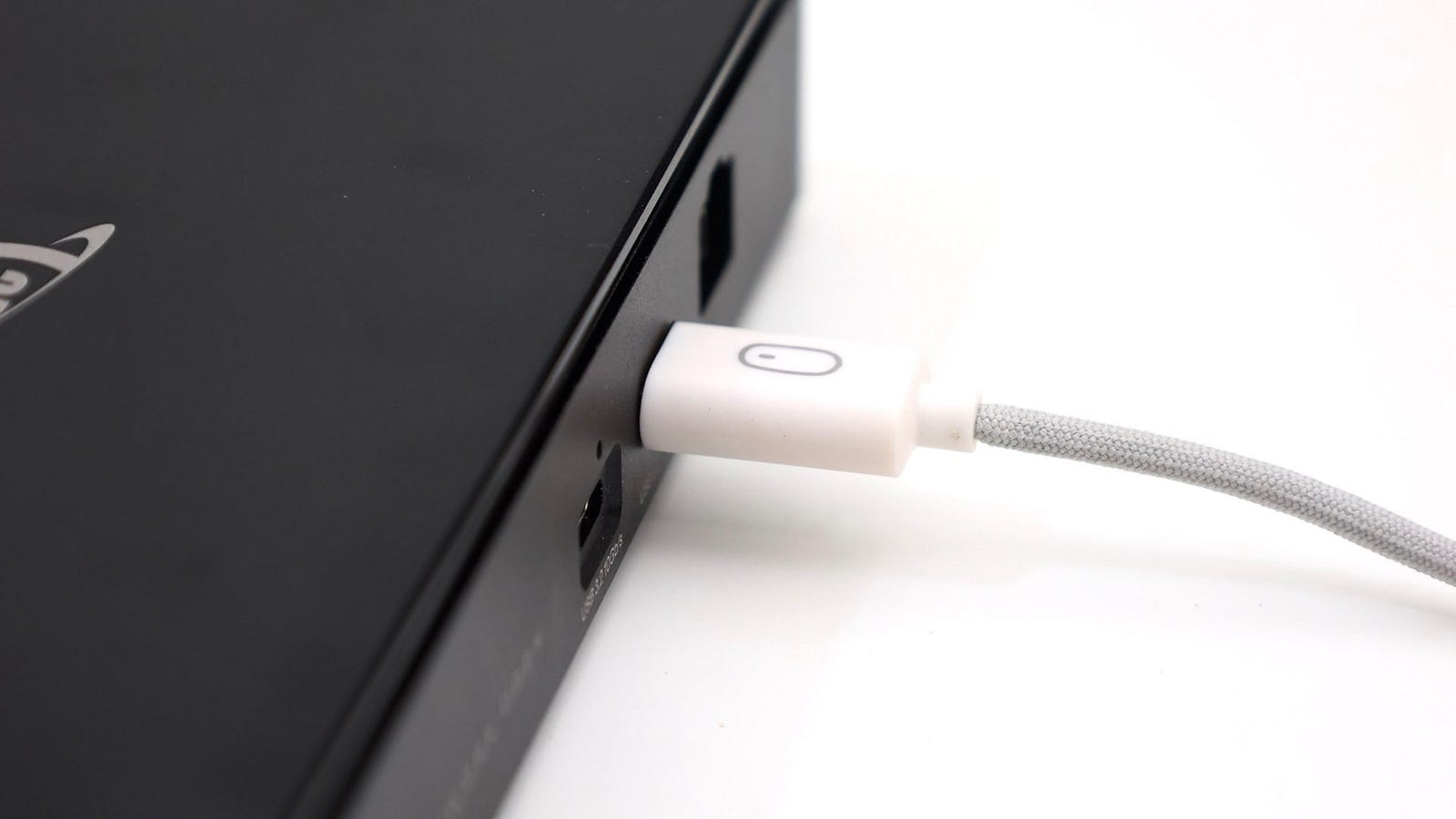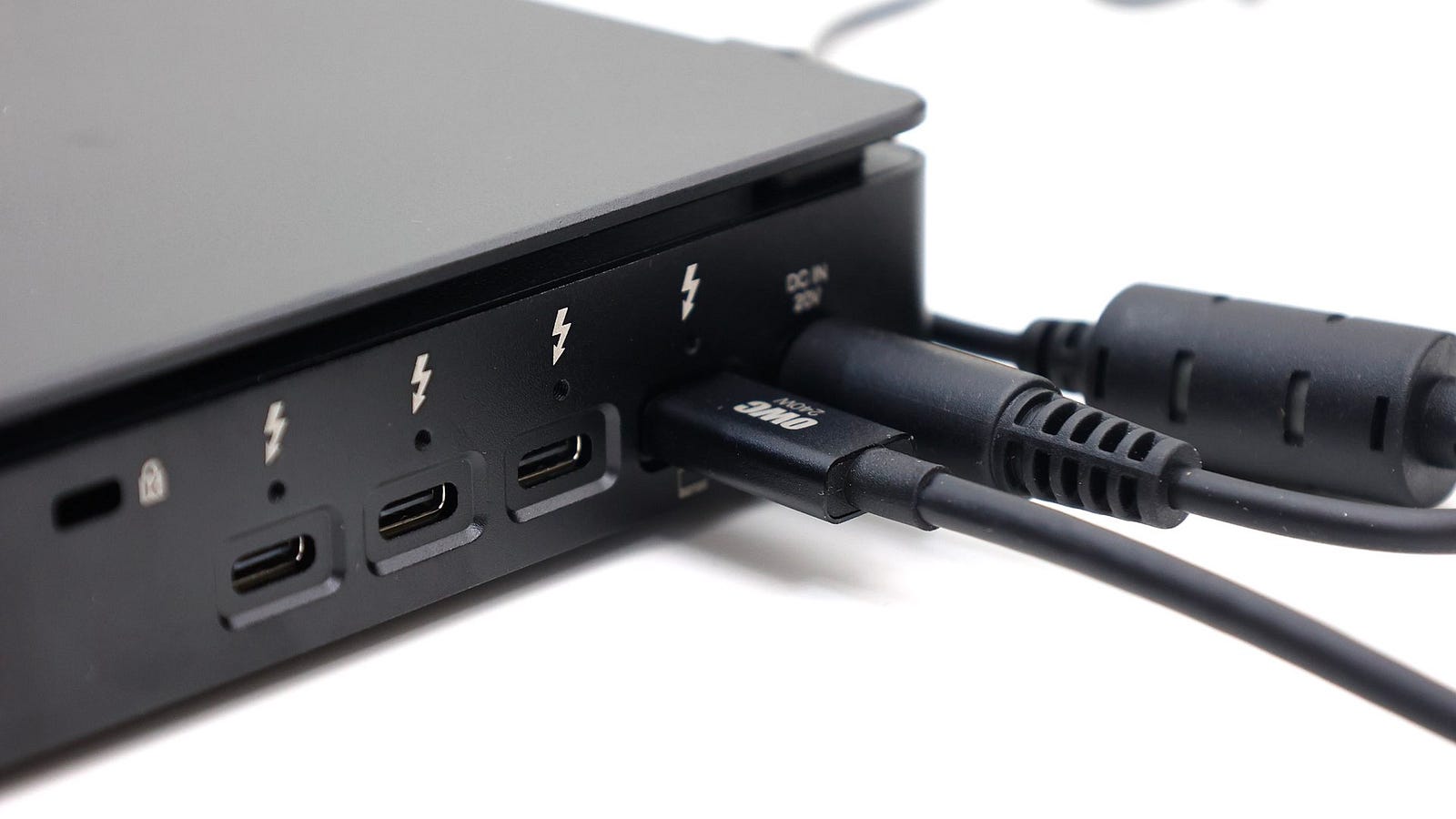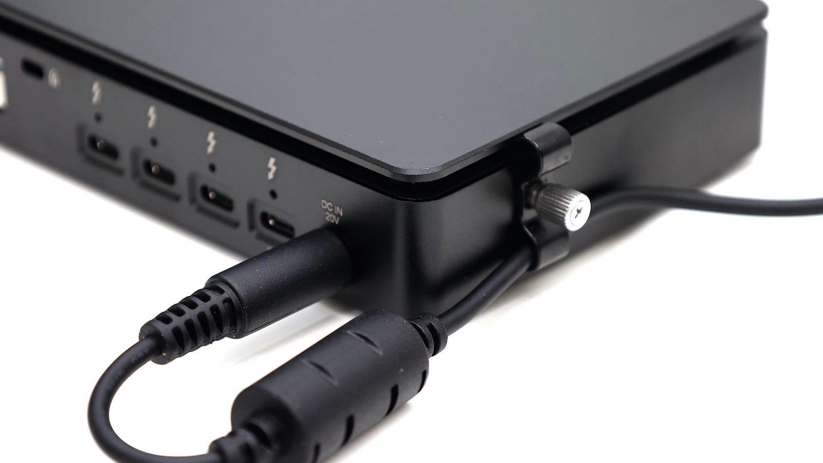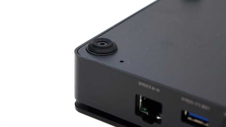 相較以往的機型使用了 6pin 12V 的電源,這次回歸了 Dock 上常見的插頭。之前的電源座、電源線上有防脫落設計,雖然是特歸,但我滿喜歡防脫落的設計。現在的電源則更通用,但插頭本身就沒有防脫落功能,倒也不是說這樣不好,因為競品其實幾乎也都沒有這個功能。但作為解決方案,讓使用者減少電源脫落的風險,側邊有一個螺絲孔,是電源線固定的位置,下圖會呈現接上電源線,並安裝線材固定器的樣貌。