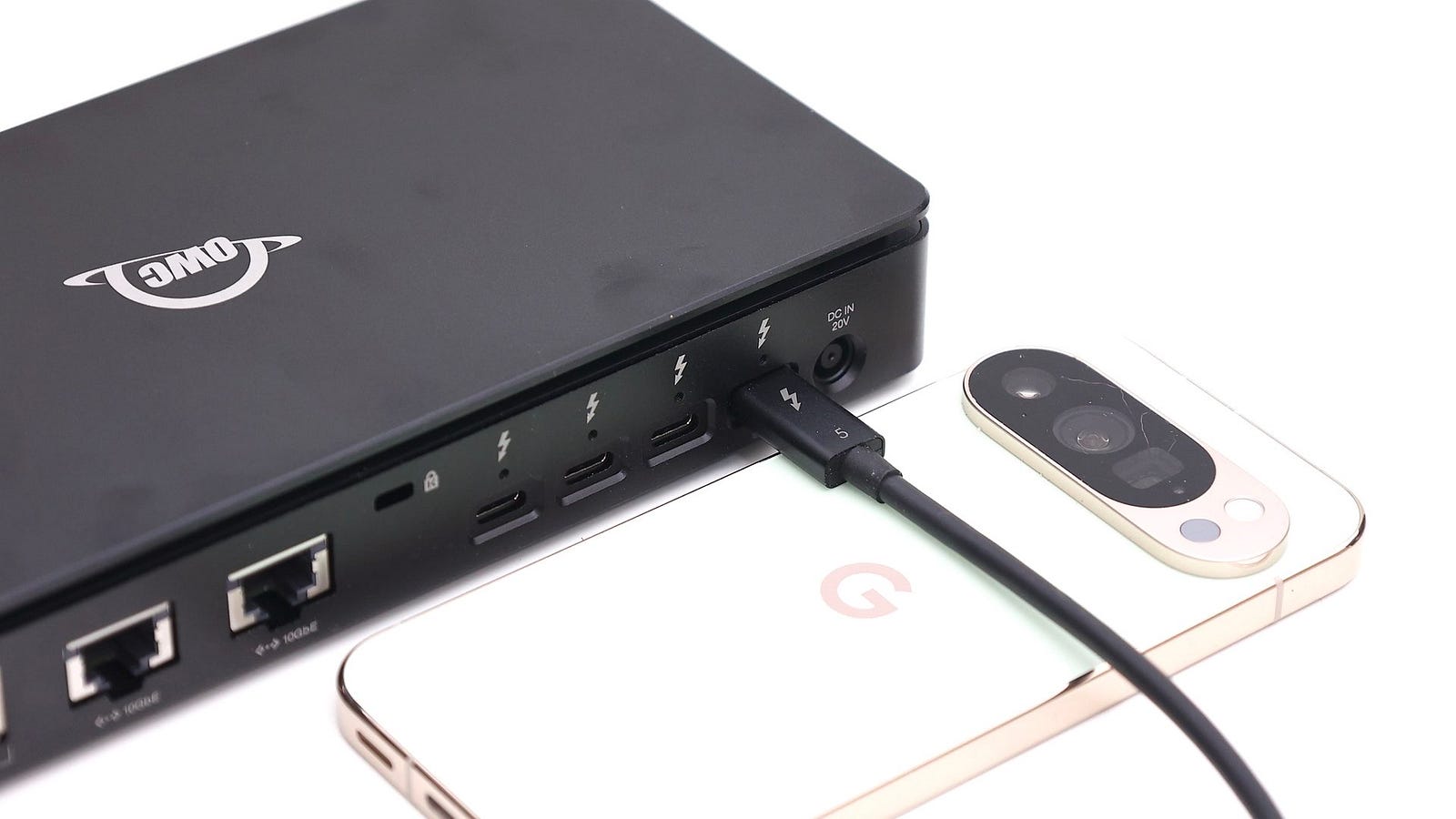 USB-C I/O 的高度也避免了過低的問題。如果太低的話,插拔 USB-C 線只剩下些微空間,不利使用者的手指操作。如圖可以看到,Dock 放在桌面上。線頭下都還可以放下一部 Google Pixel 10 Pro,對於插拔線材來說不成問題。