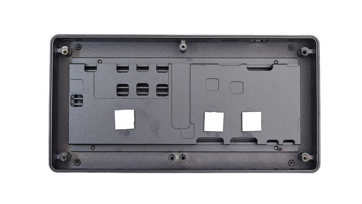 拆開腳墊下的螺絲,打開底蓋。需要一點方向輔助,將主板取出,就可以看到頂蓋。頂蓋有大範圍的散熱金屬,透過導熱貼片帶走主要熱源 IC 的熱。
