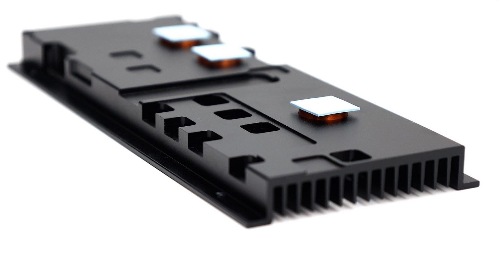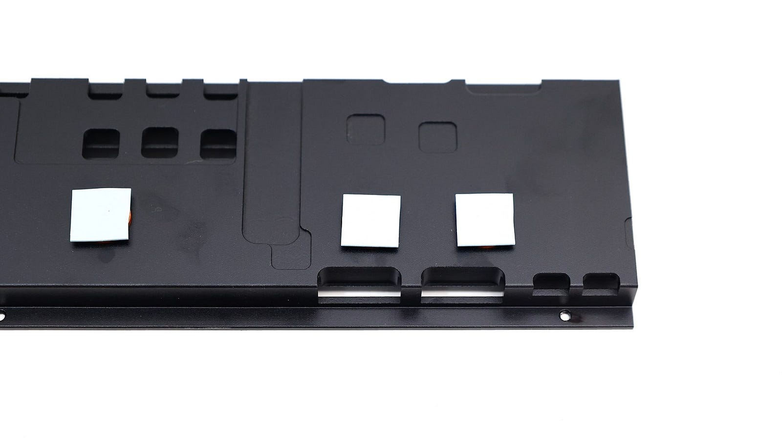 一整片的散熱鰭片,甚至可以說是散熱平台。本體應該是鋁擠型製作,並在三個主要 IC 的位置加上了銅柱,加強散熱速度,做到了完全無風扇的被動散熱,也意味著無機械噪音。對於追求靜音的從業者來說,無疑也是一大優勢。