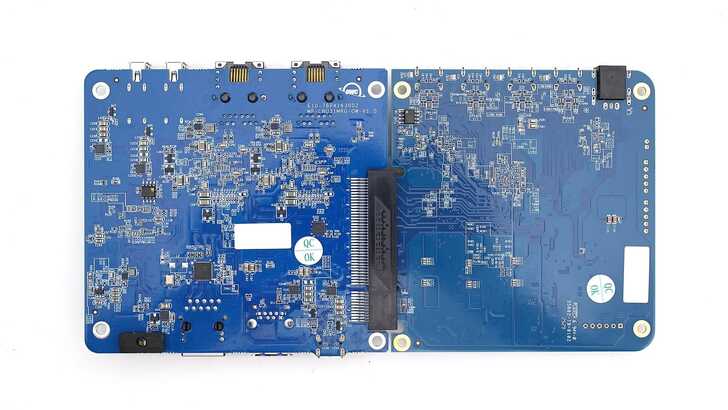 由於 Dual 10GbE Network Dock 除了亮點的網路功能,其他基本上就是 Thunderbolt 5 本身會有的 I/O Downstream,所以 IC 部分能說的不多。可以看到主要有兩片,透過中間的 PCIe x4 連接。左邊的板子,主要有兩顆 10GbE 的網路晶片為 Marvell AQC113。右邊的板子,則是 Thunderbolt 5 IC 為 Intel JHL9480。這三顆晶片,也就是頂蓋散熱接觸的 IC。