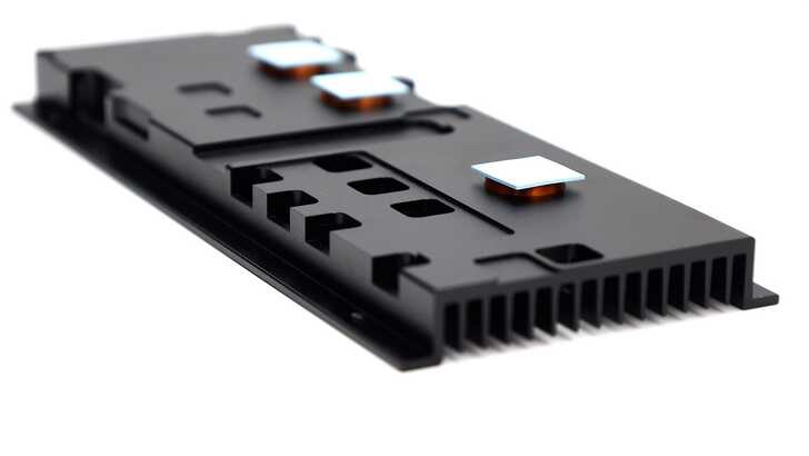 或許是為了進一步加大散熱鰭片面積,又要將 Dock 壓縮在一定體積內。可以看到鋁擠型對應 I/O Port 位置,以 CNC 切削凹槽,避開機構干涉,才形成形狀特殊的散熱模組。