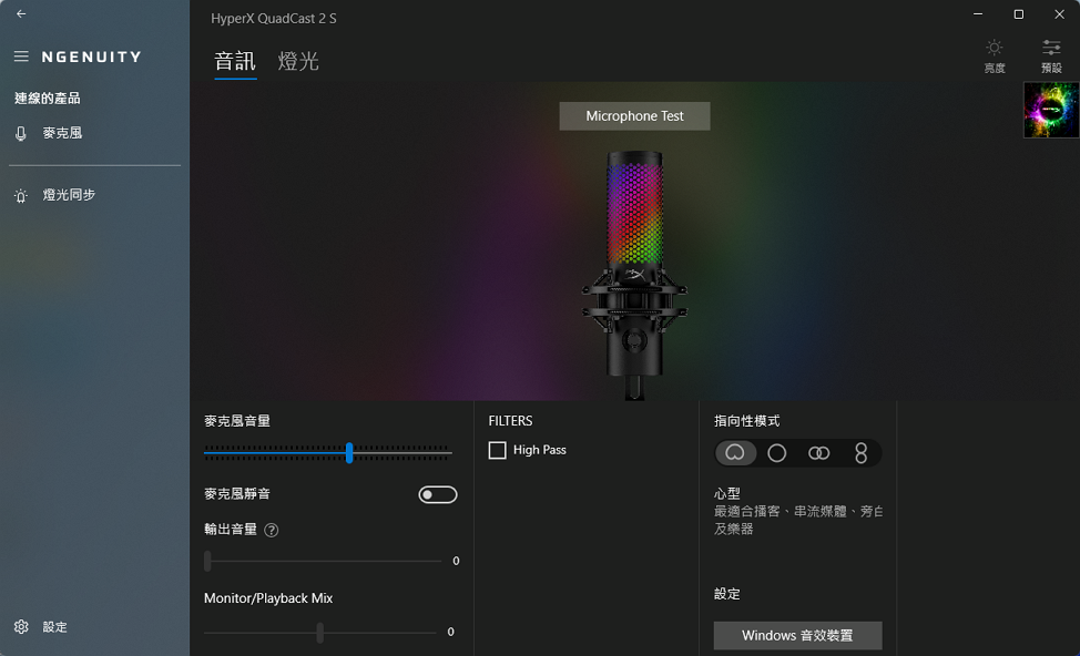 接上麥克風之後透過HyperX NGENUITY控制