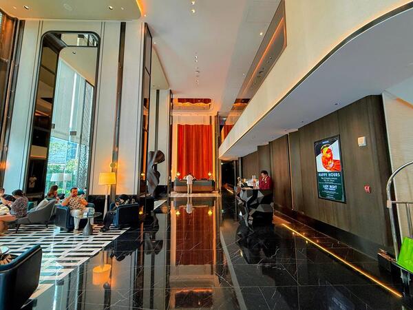 曼谷素坤逸洲際最大的優勢之一,就是交通相當省力,搭乘BTS到通羅站步行約6分鐘即可抵達,不想拖行李走路也能直接叫車到門口。飯店整體設計延續洲際品牌一貫的高級質感,融合泰式細節與現代元素,挑高大廳搭配大片落地窗,白天自然光灑落,空間感明亮舒適;地板、金屬線條與深色家具的搭配,讓整體氛圍呈現低調但有記憶點的奢華感,也難怪不少旅客一進門就忍不住在旋轉樓梯與窗景前拍照打卡。