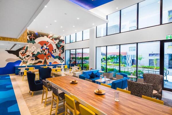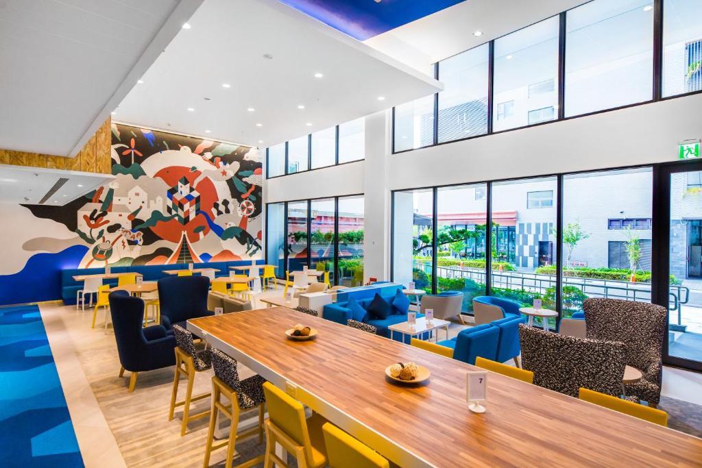 飯店隸屬 IHG 洲際酒店集團 旗下「Holiday Inn Express」品牌。一進入飯店大廳,便能感受到與傳統商務飯店不同的氛圍。整體空間 採光明亮、色彩活潑,牆面藝術由插畫家 57 創作,讓公共空多了幾分輕鬆感。一樓同時也是早餐用餐區,全天候提供咖啡與茶飲,且開放旅客外食,對於逛完夜市後想回飯店繼續聊天、用餐的旅客來說相當便利。