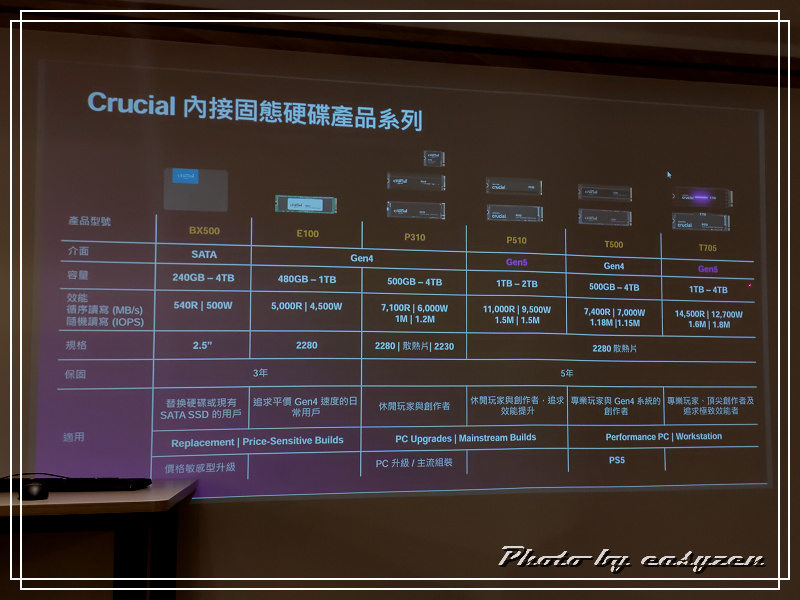 這部分呈現了美光在 M.2 2230 (掌機專用) 到最新的 Gen5 T710 (15GB/s 極速) 都有完整佈局。