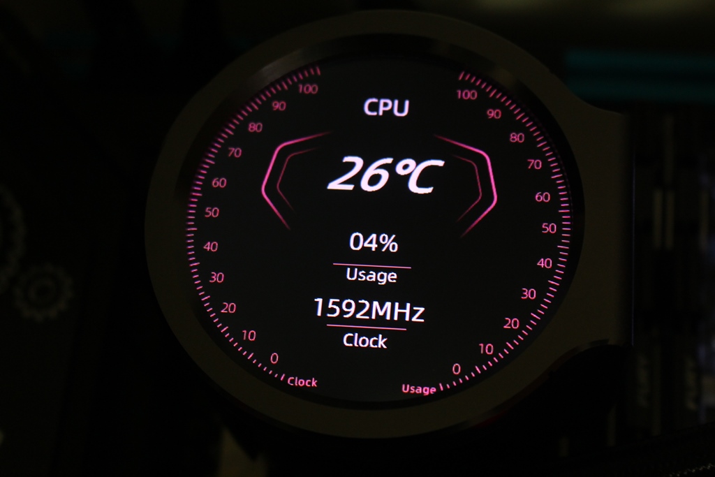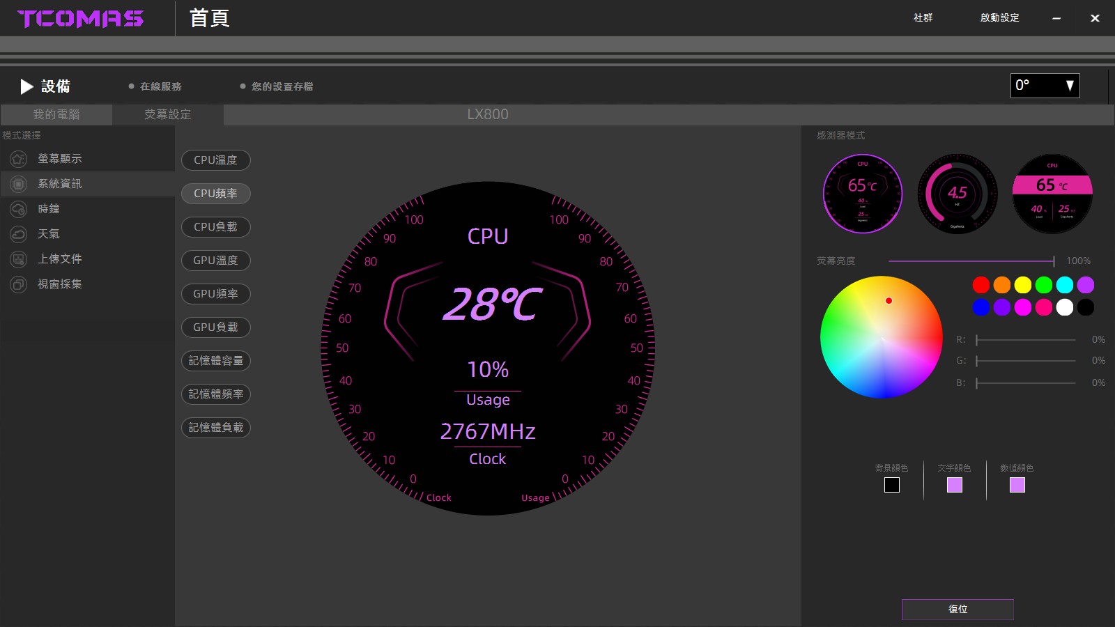 ▼螢幕可以設定系統監控,可選擇CPU、GPU或記憶體的資訊,每一個模式都可以做細項設定與呈現方式挑選,細部設定包含螢幕亮度、背景顏色、文字顏色與數值顏色