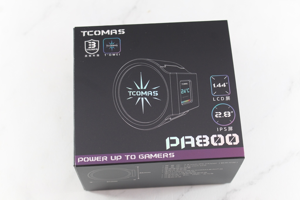 之前介紹過鈦坦TCOMAS LG700 PRO 360一體式水冷散熱器,他們家還有另一款水冷LX800 PRO 360,不過呢LX800 PRO與LG700 PRO的差異只有在水冷頭上的螢幕,也就是說透過水冷頭的更換就可以把LG700 PRO變成LX800 PRO,玩家可以透過入手『PA800』螢幕達成,PA800是2.8吋IPS圓形螢幕加上1.44吋方形螢幕組成,2.8吋的圓形螢幕可以透過專用軟體可以設定圖片、gif動畫與影片,也可以設定系統監控資訊,讓玩家可以展現自我風格,側邊的1.44吋方形螢幕則是顯示水冷液的溫度,螢幕外殼採用紋理素料搭配鋁合金材質,整體質感非常出色,介面採用USB 2.0連接,安裝非常簡單方便,馬上就來看鈦坦TCOMAS PA800水冷螢幕吧!