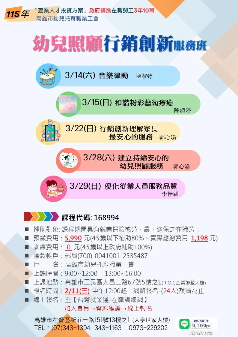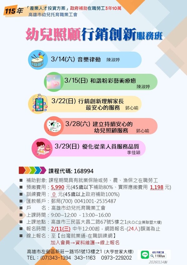 高雄市幼兒托育職業工會推出「幼兒照顧行銷創新服務班」,結合理論與實務,從服務設計、行銷思維到人員品質全面強化,協助第一線從業人員升級專業。