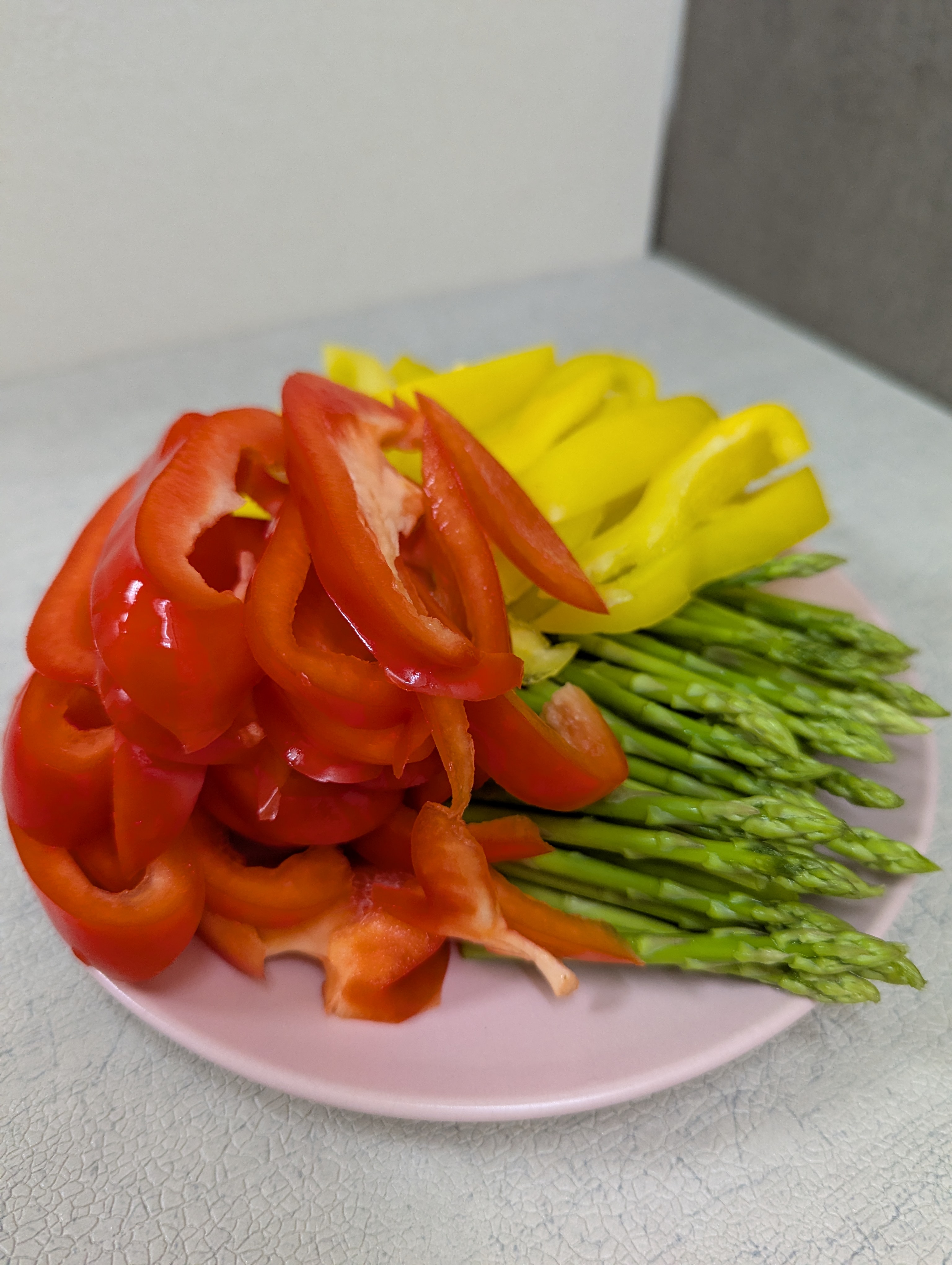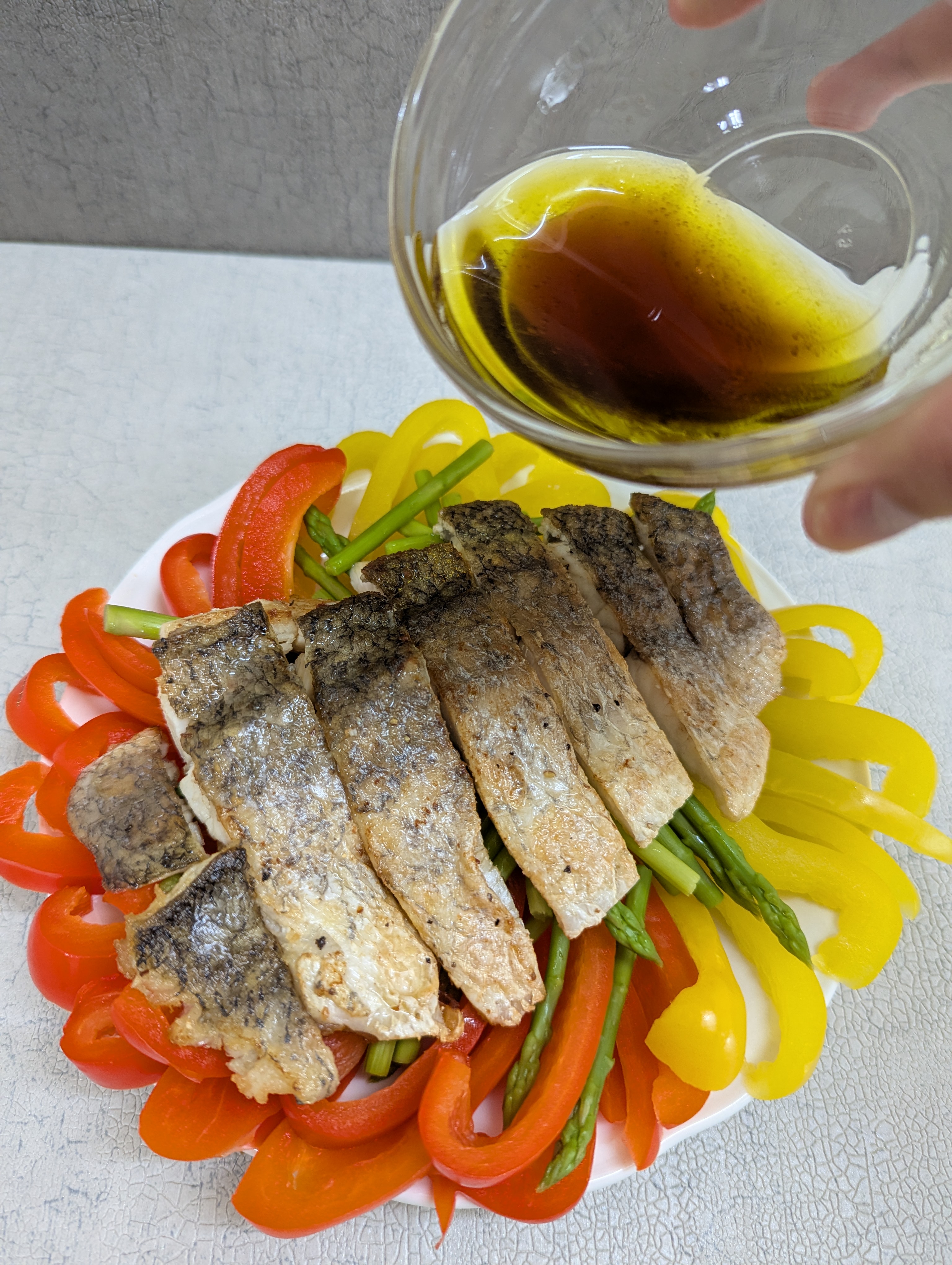 擺盤: 底下鋪上汆燙後的彩椒及蘆筍,放上剛起鍋熱騰騰的鱸魚片。