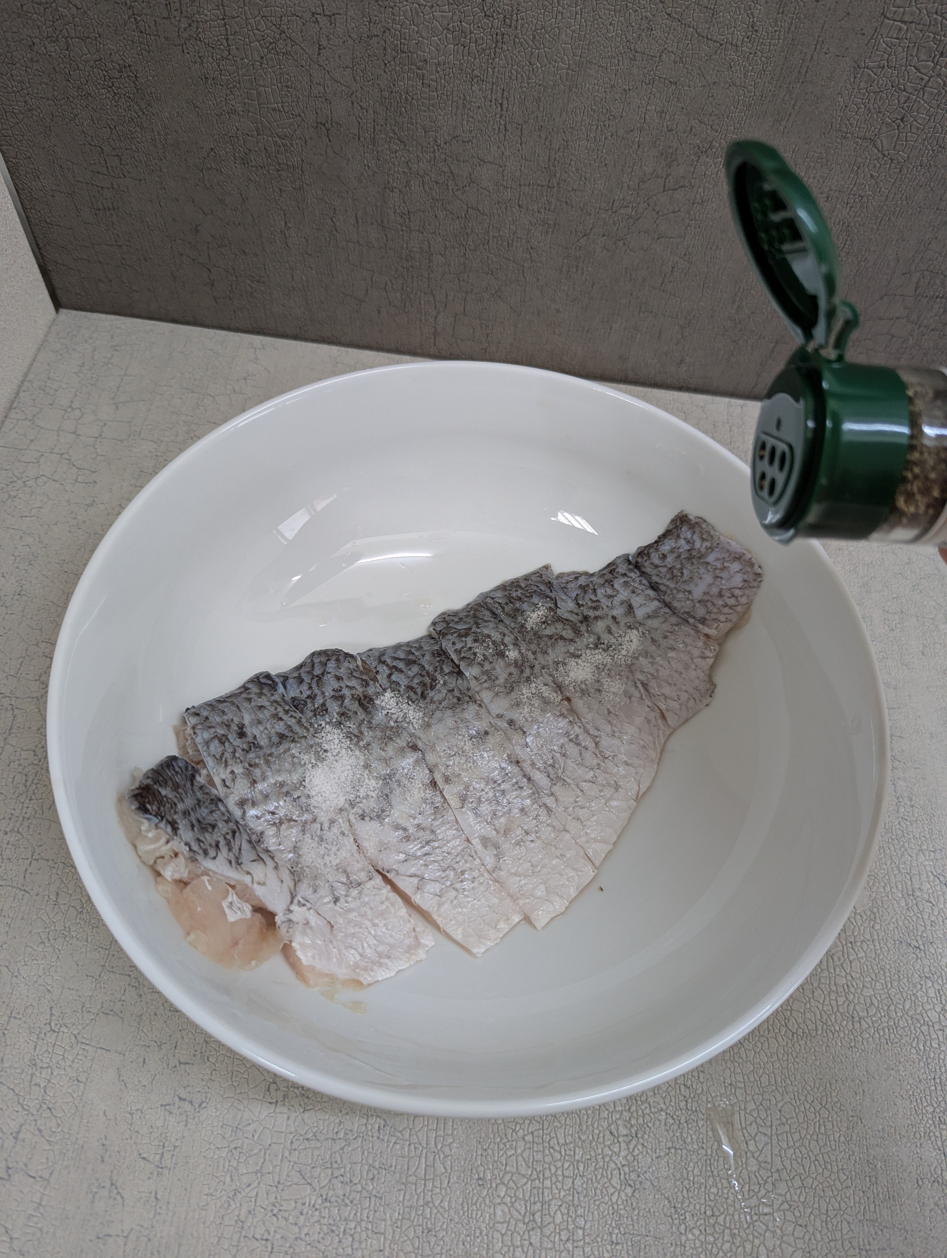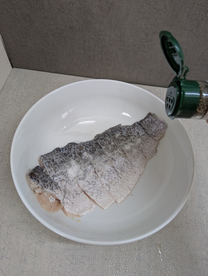 調味:將前一晚退冰的鱸魚切成適當大小,撒上鹽巴及胡椒調味。