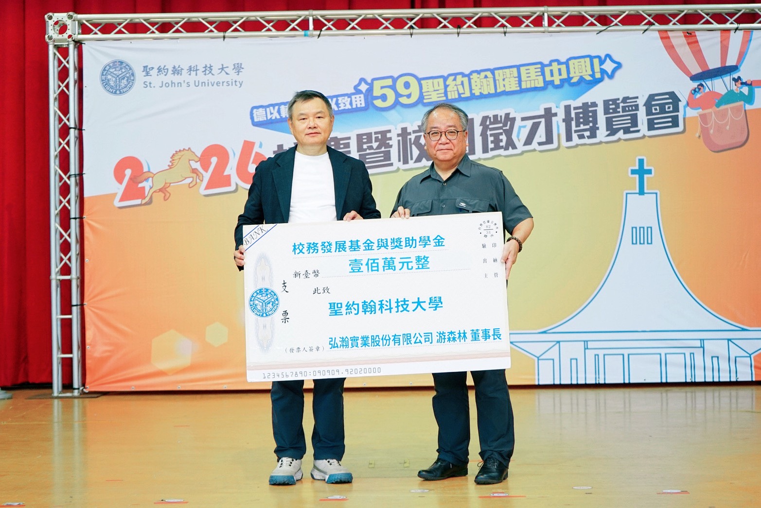 聖約翰科技大學舉辦「59週年校慶慶祝大會」,在曾鴻鍊執行董事(中)見證下,賴俊年董事(左)代表「新埔之星」捐助新臺幣382萬元給母校,由唐彥博校長(右)代表受贈。