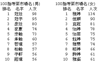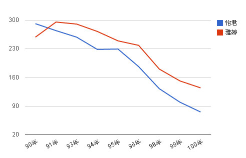 雅婷依然在女生部份獨占鰲頭,怡君則已退到三名之外,很可能在未來幾年跌停全額交割。雅婷的基本盤支撐力道足,雖然逐年穩步下跌,但再連霸個一兩年應該還有機會,不若怡君那樣的快速下跌。而竄起的超新星則是讓人有些驚訝的「佳穎」,佳穎從94年的第18名、78人,一直到今年100年的第二名、90人。雖然數字上來說並沒有大幅的增長,是否這也反應了台灣少子化的影響?
