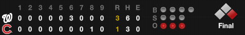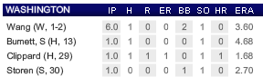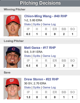 投81球六局一安打兩保送一三振,目前防禦率 3.60,國民以 3:0 領先,勝投候選人,總共投81球,53個好球28個壞球,12個滾地球出局5個飛球出局,球種使用伸卡球 81% 滑球 15% 快速指叉球 4%,以及一顆整場只出現一個的曲球,直球球速最快來到94mph(約151km/h)。