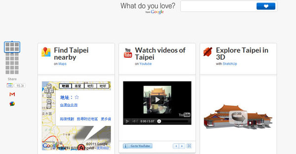 ↑What Do You LOVE ? 的服務包括基本的地圖、影片、3D 模型、圖片、翻譯等許多 Google 服務,都整在在同一個頁面,方便使用者查詢資料。