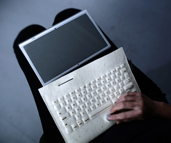平板電腦保護袋沒什麼特別,但有鍵盤的平板電腦保護袋可就有特色了!設計師 Roni Margolin 推出一款毛氈材質的平板保護袋,同時也加上鍵盤跟滑鼠功能,平常一般使用時就是個單純的保護套,不過只要接上 USB 接孔就能直接用保護套打字,相當的新奇創新又省空間。