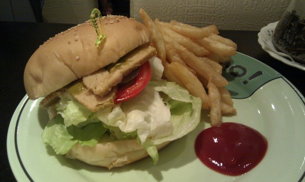 ▼ 青醬漢堡,品品99所有的餐點都是素的,但吃起來感覺十分厚實,薯條是帶皮的那種,與濃特利的相近,而不會像21世紀那麼硬,漢堡吃起來蔬菜很多,裡頭的配料與醬料也很不錯,唯一能挑剔的大概只有漢堡麵包,雖然先烤過了,吃起來口感也不差,但就像是高級版的美而美漢堡麵包。