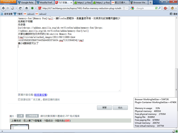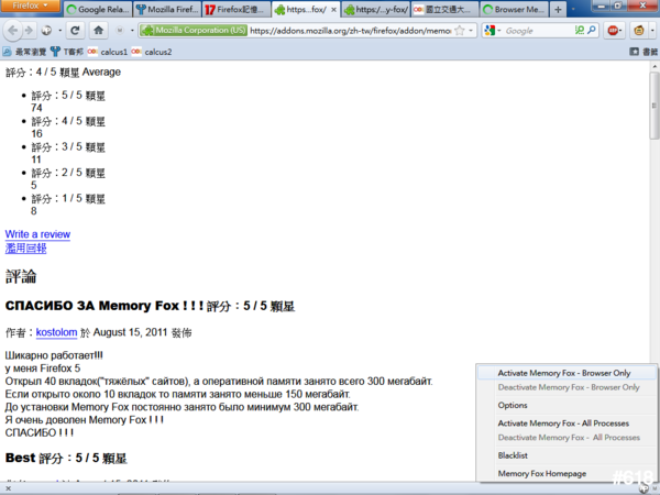 如果Firefox開啟大量分頁會有記憶體用量遲遲下不來的危機,雖然沒有Chrome嚴重但對重量使用者還是造成困擾,在此推薦Memory Fox,讓Firefox更輕快,是重量使用者,如果原先記憶體用量較少效果較不明顯