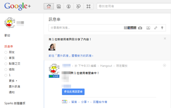 Google+ 讓我最喜歡的其中一個地方是他可以一邊視訊一邊打文字訊息,且直接可以支援多人同時視訊(Skype 的需要加值帳戶才可以),雖然視訊就是要用嘴巴來說話,但有時文字訊息仍是不可或缺的,傳連結啊、一些需要複製的文字等等。