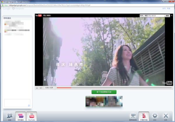 ▼ 就算只有一個朋友加入也要視訊一下,左邊可以看到文字訊息列,可以在下面的按鈕列來決定要打開哪些功能。在這裡的 Youtube 影片已經是同步的囉,也就是說所以參與視訊的朋友看到的影片進度都會是一樣的,如果拿來作正經用途的話,應該可以用來作工作上的討論。作娛樂用途的話就是…像我們這樣XDDDD