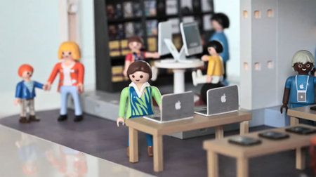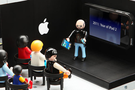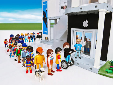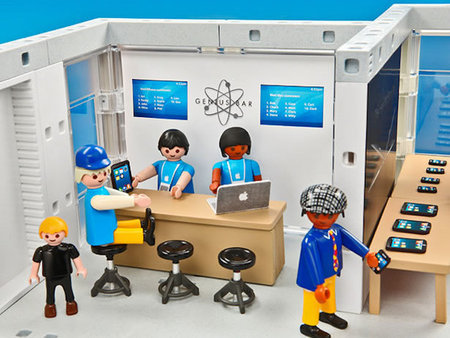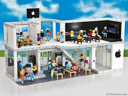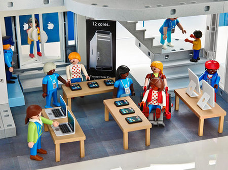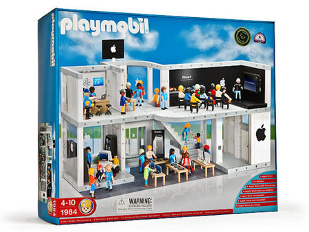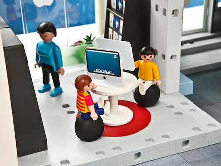 上面的東西看來可能都沒有下面這樣玩具來的厲害,這款由 playmobil 所生產的蘋果電腦公司組合包,看來就像是樂高玩具一樣,將真實版的蘋果商店縮小了。除了許多像蘋果商店的場景外,連賈伯斯舉辦說明會的場景也仿得維妙維肖 XD