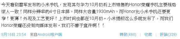 而同樣是中國手機廠的華為看到這種情形亦不甘示弱,其營銷總監余承東在其微博跳出來放話說:「今天看到雷軍發布的小米手機,發現其與華為10月初將上市銷售的 Honor 榮耀手機主要規格驚人一致!」