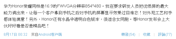 余承東還說:「小米提前這麼多就發布了,而我們的 Honor 榮耀還没有向媒體發布。我們不善於宣傳啊!」余承東也認為,小米手機之所以能賣得這麼便宜,是因為採用「網路銷售」,而這種銷售方式是值得借鑒的。余承東在之前也說道「華為 Honor 榮耀手機更薄更窄更容易單手操作。功耗更低,待機及通話時間更長。」而流出的訊息也指出,Honor 將會附上 1900mah 的電池,主要機身會是塑膠材質,厚度為 9.7mm,四吋螢幕、854x480解析度。售價傳為比小米手機更低一些的 1888 人民幣(8500 台幣左右)