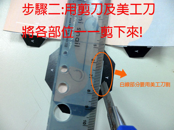 →然後就可以開工了,先用剪刀一一把個部分剪下來。然後要注意圖片中還色的線要用美工刀切開,But!!!!!!!!!不能切斷喔~這是等下要組裝用的