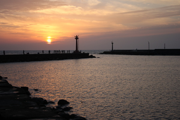 永安漁港的出海口與燈塔夕陽