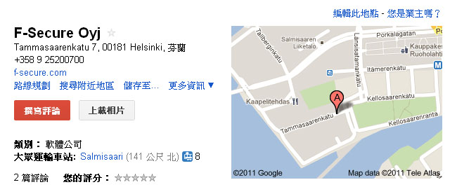 究竟為什麼會這樣?我們可以實際來看看,下面這是F-Secue芬蘭總部在Google地圖上的位置: