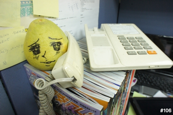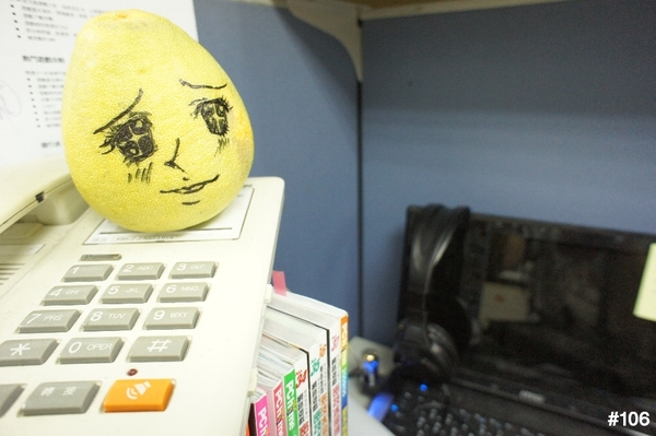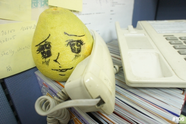 中秋節快到了 各方廠商自然很厚禮數的送來一堆月餅柚子 媽媽雖然有說過不可以玩食物 阿恩勾如果只是一直吃 那也只有徒增體重一點意義都妹有╮(╯_╰)╭ 所以我們就用文旦開發出了一項新時代的產品,讓偶們一起看下企(彈食指) 幫忙接電話的俏秘書,解決截稿期沒空接電話的困擾 缺點是會跟客戶調情過度,忘記說正事 並且過度自戀,嚴重干擾同事上班 身材非常嬌小,身高體重約等於一個文旦,適合放在辦公室 非常愛乾淨,碰到髒亂桌面時會用看垃圾的眼神看座位主人 3 個人說讚 收藏 快速回應 引言回應