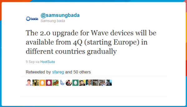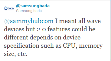 ▲ Samsung 於推特上表示將會升級所有的 Bada 手機,但有些 Bada 2.0 的功能可能會因為手機的記憶體、CPU 等差異會有所不同。而升級時程將會落在第四季,從歐洲開始。