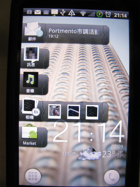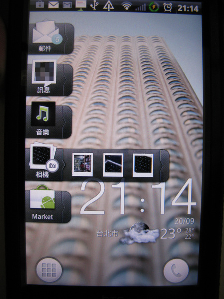 ▲ 由於螢幕截圖軟體一直搞不定(Root好像怪怪的),本篇只好以相機直接拍,大家只好將就一下囉。由照片中可以看到,這次的桌面從原本經典翻頁時鐘改成一個裡頭稱之為「快速啟動」的小工具,這五條列可以自己指定 app 上去,但如果不支援的話就會僅是一個程式捷徑,如果有支援的話就繪圖中所示:相機的那一列不但有一個快速捷徑,且點開來有相片的預覽。