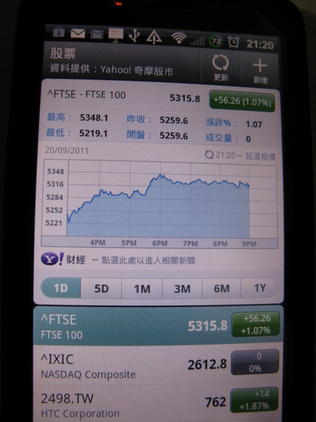 ▲ 股票也是一樣分成上下兩部份,對於螢幕空間運用更上一層樓,唉,台股一片慘綠就不拍出來了…(此人已經快跌掉一隻手機了)