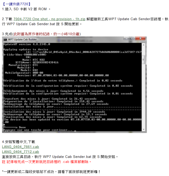 在使用 WP7 Update Cab Sender 來更新的時候,WIN7 的使用者請注意,不用特意去用右鍵系統管理員身份執行,直接點即可,用系統管理員反而會有問題。另外 Zune 同步軟體也要記得關掉,不然兩邊會搶。通常在 7403 以前的更新都不會花很久時間,但在 7403 - 7661 這邊會花大概一個多小時,不用心急,給他跑。在之後的 7661 - 7720 也是,就讓他跑完。有可能進入系統時 WP7 Update Cab Sender 還在跑,就等到他自己跑完。如果遇到紅字的錯誤,請檢查一下 WP7 Update Cab Sender 傳進去的檔案是不是正確的,有沒有多傳或少傳,或是版本號檔案放錯了,再不行就硬重啟一次試試看。加油!只要有耐心,一定可以升級完成的!