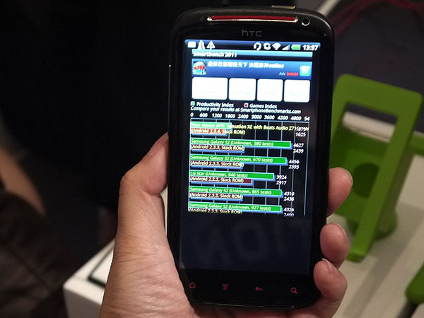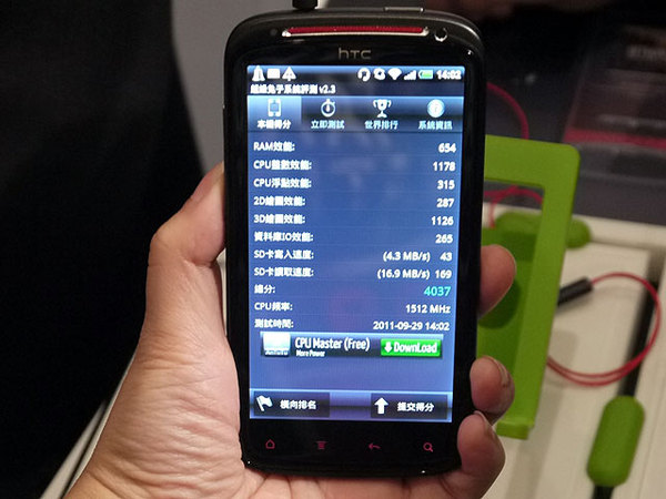 ▼HTC Sensation XE 的效能測試,比起 SAMSUNG S2 遜了許多,雖然升級到 1.5GHz 但感覺沒差多少,可能跟 HTC Sense 拖慢效能有關。