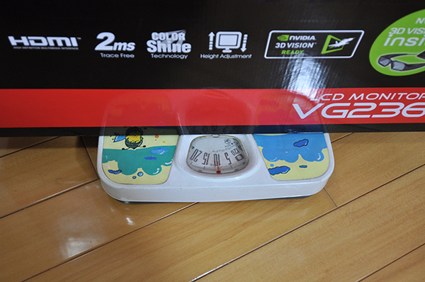 直接放上體重計測重,足足有10公斤重,這可能是因為VG236H仍使用CCFL背光而不是現在流行的側照式LED背光(普通銀幕不太可能用直下式LED)。