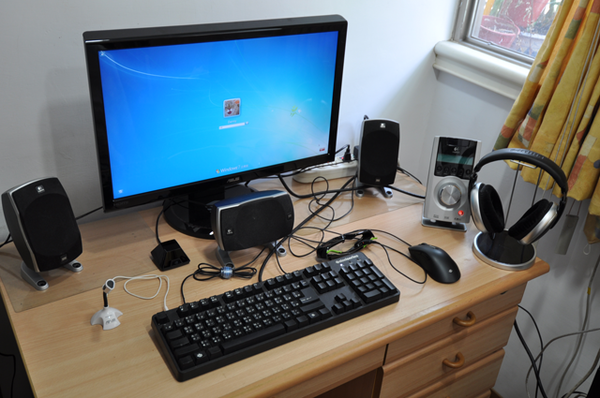 實際上機測試,因為電腦配備很爛就不拿出來給大家鞭了,主要顯卡只用9400GT來測,其實8600GT效能比較好但是9400GT有原生HDMI介面,有用HDMI測看看3D Vision結果證實不行而且銀幕閃爍嚴重,等等再來講為什麼,圖裡可以看到週邊有羅技Z5500(背光容易壞我自己改過),Steelseries 7G(黑軸,直上直下才是王道,部分換成Ducky黑同刻)、微軟舒適6000蠻好用的我很推薦(藍光喔,其實本來滑鼠是Ikari Optical但是我修微動修到快發瘋,修了不下10次都是用omron jp的還這樣(/‵ ′)/~ ╧╧),耳機是CP直很高的窮人救星飛利浦SHP 895,已經停產了後繼機種SHP 8900我也有買但是還是比較喜歡895,啊~有點離題了。
