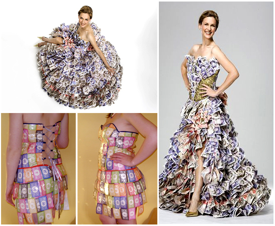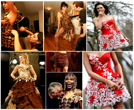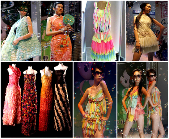你以為洋裝都是用布做的嘛?那可就錯了,除了布以外,現在還有多種奇特的洋裝材質喔!包括吃的蔬菜、糖果、巧克力或是報紙、信用卡、氣球、保險套等,甚至是頭髮都可以拿來作成洋裝喔!